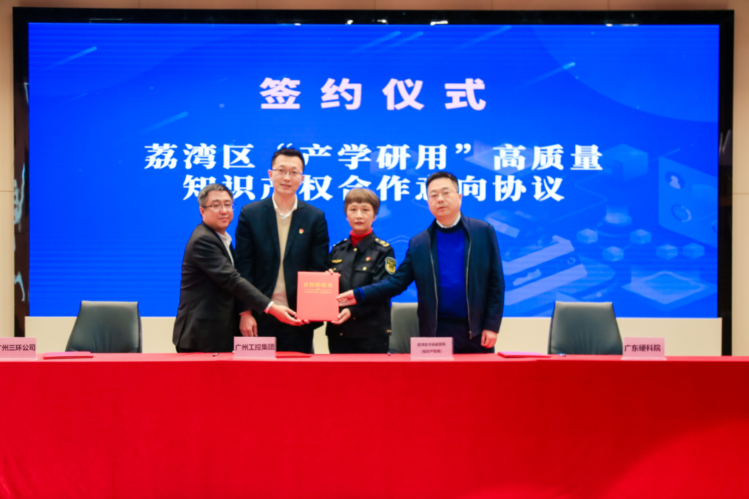 在本次活動中,三環(huán)與荔灣區(qū)市場監(jiān)督管理局、廣州工業(yè)投資控股集團有限公司、廣東粵港澳大灣區(qū)硬科技創(chuàng)新研究院(以下簡稱“廣東硬科院”)共同簽訂了《荔灣區(qū)“產(chǎn)學(xué)研用”高質(zhì)量知識產(chǎn)權(quán)合作意向協(xié)議書》,該協(xié)議以搭建荔灣區(qū)“產(chǎn)學(xué)研用”知識產(chǎn)權(quán)創(chuàng)造轉(zhuǎn)化平臺為目標(biāo),旨在探索政府、高等院校、科研院所、企業(yè)、知識產(chǎn)權(quán)服務(wù)機構(gòu)在知識產(chǎn)權(quán)工作中的共贏模式,并確立四方在今后荔灣知識產(chǎn)權(quán)高質(zhì)量發(fā)展工作中的合作意向。