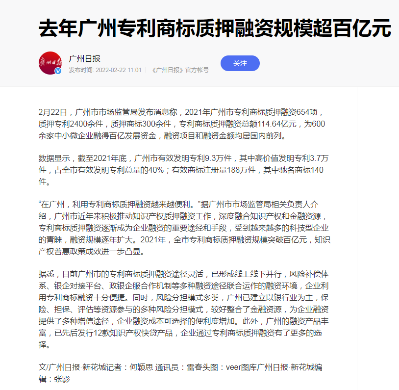 2月22日,廣州市市場監督管理局發布消息稱,2021年廣州市專利商標質押融資654項,專利商標質押融資總額114.64億元,其中,質押專利2400余件,質押商標300余件,為600余家中小微企業融得百億發展資金,融資項目和融資金額均居國內前列。