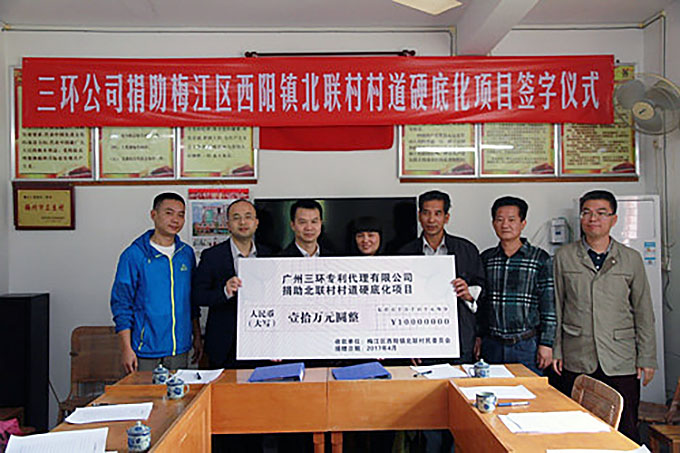 2017年4月,三環總經理郝傳鑫赴梅州市梅江區北聯村,在廣州市知識產權局局長鄧佑滿的見證下,與北聯村簽訂了“北聯村村道硬底化項目捐建協議”,捐助10萬元,專項用于村道建設。該項目的實施,將實現全村所有自然村通水泥路,為村民出行和運輸水果提供了出行方便,為北聯村實現脫貧打下了良好基礎。