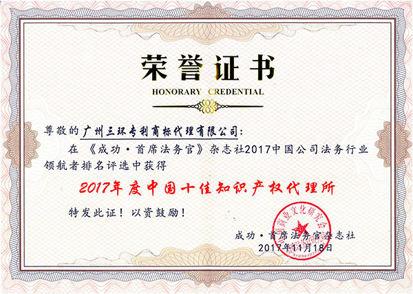 2017年11月18日,由《首席法務(wù)官》雜志牽頭主辦,中國首席法務(wù)官研究院和中國法治企業(yè)研究院協(xié)辦,旨在尋找中國公司法務(wù)行業(yè)的優(yōu)秀法務(wù)部門、標(biāo)桿律所以及杰出法務(wù)人員的評(píng)選活動(dòng)——《2017年度中國公司法務(wù)行業(yè)“領(lǐng)航者”十佳榜單》隆重舉行。經(jīng)過數(shù)月的網(wǎng)絡(luò)投票評(píng)選并綜合專家評(píng)審的專業(yè)意見,最終評(píng)選出四個(gè)部門大獎(jiǎng)、四個(gè)人物大獎(jiǎng)以及兩個(gè)代理所大獎(jiǎng)。其中,廣州三環(huán)專利商標(biāo)代理有限公司光榮入選《2017年度中國十佳知識(shí)產(chǎn)權(quán)代理所》榜單。
